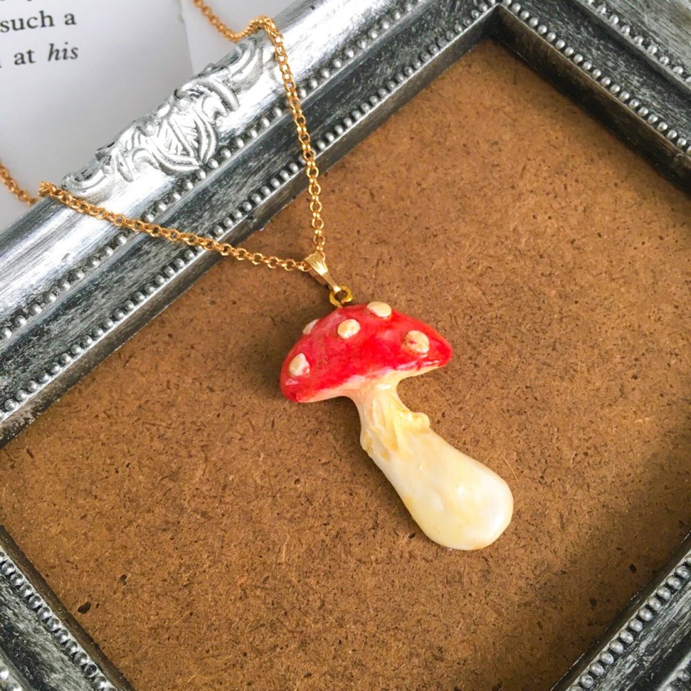 アンティークビスクドールを目指して作った、石塑粘土のキノコネックレスです。