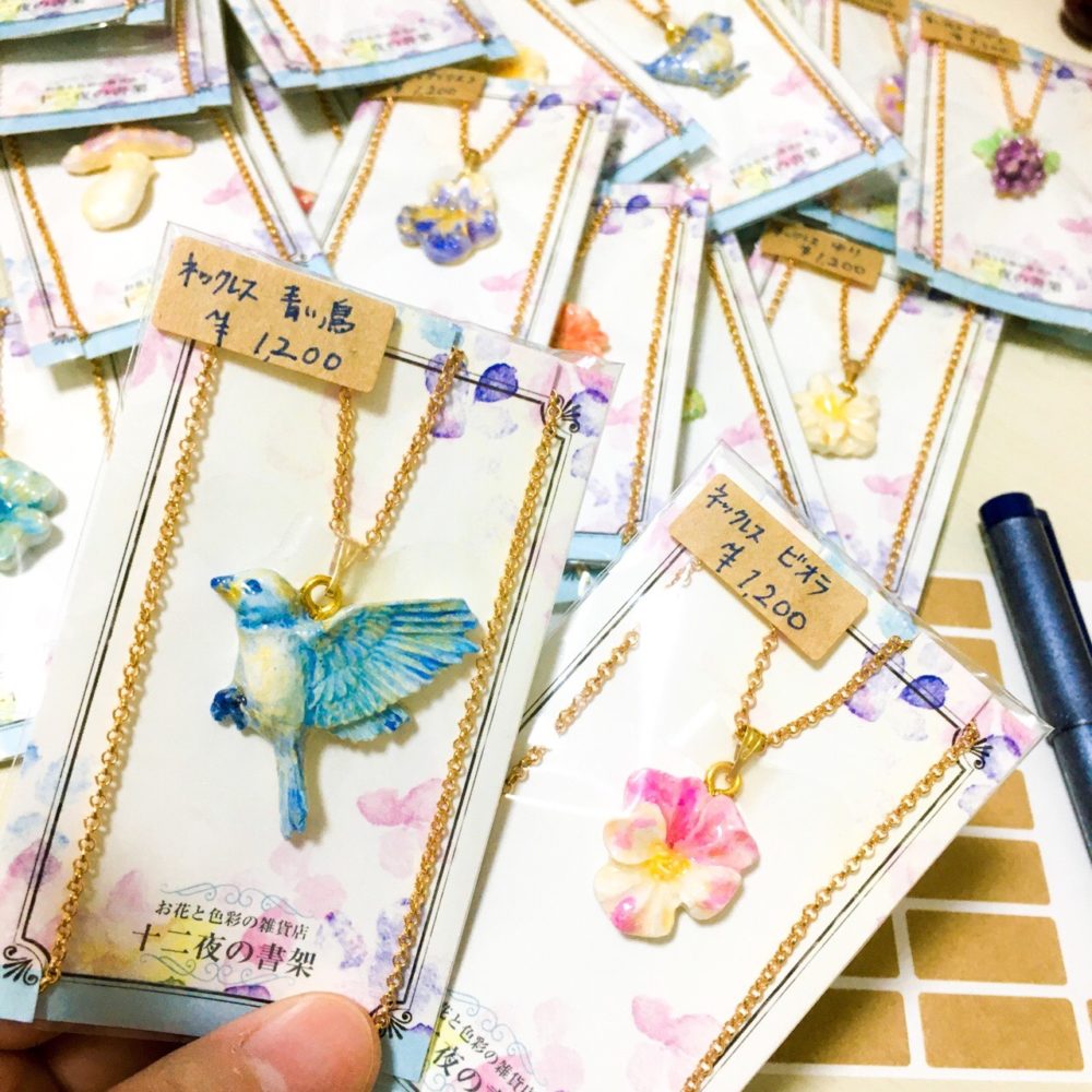 石塑粘土で作って、アンティーク風に塗装した陶器風のネックレスやイヤリングは人気でした。