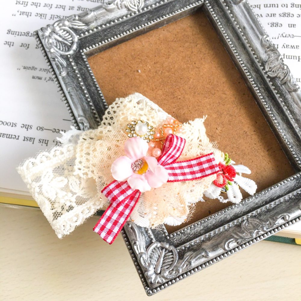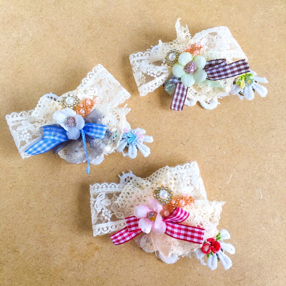 なんといっても種類が豊富。小ぶりなヘアゴムやヘアクリップから、大ぶりのインパクトのあるサイズのヘアクリップまで、何種類ものレースと、お花やビーズやボタンでレトロな雰囲気にお仕立てしました。