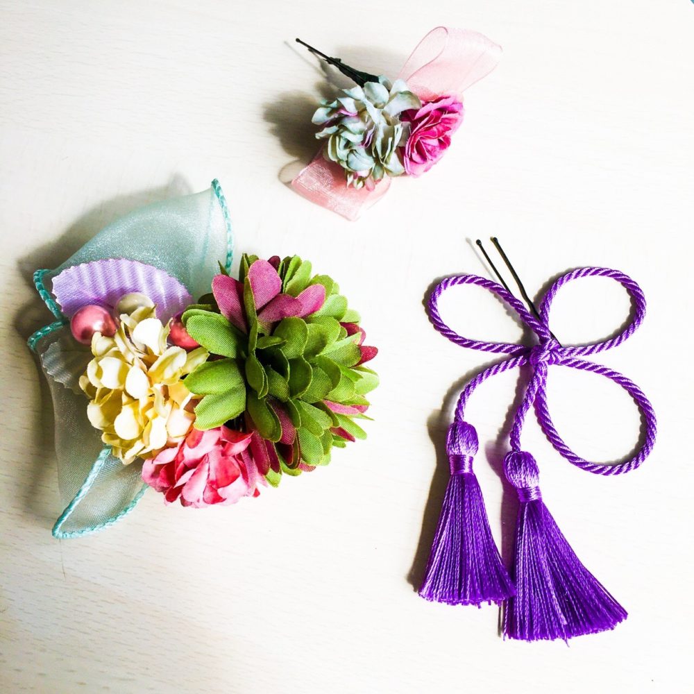 オーガンジーとピンポンマムをメインクリップブローチに、薔薇とマムのUピン、三つ輪の叶結びタッセルUピン、3点セットの髪飾りです。