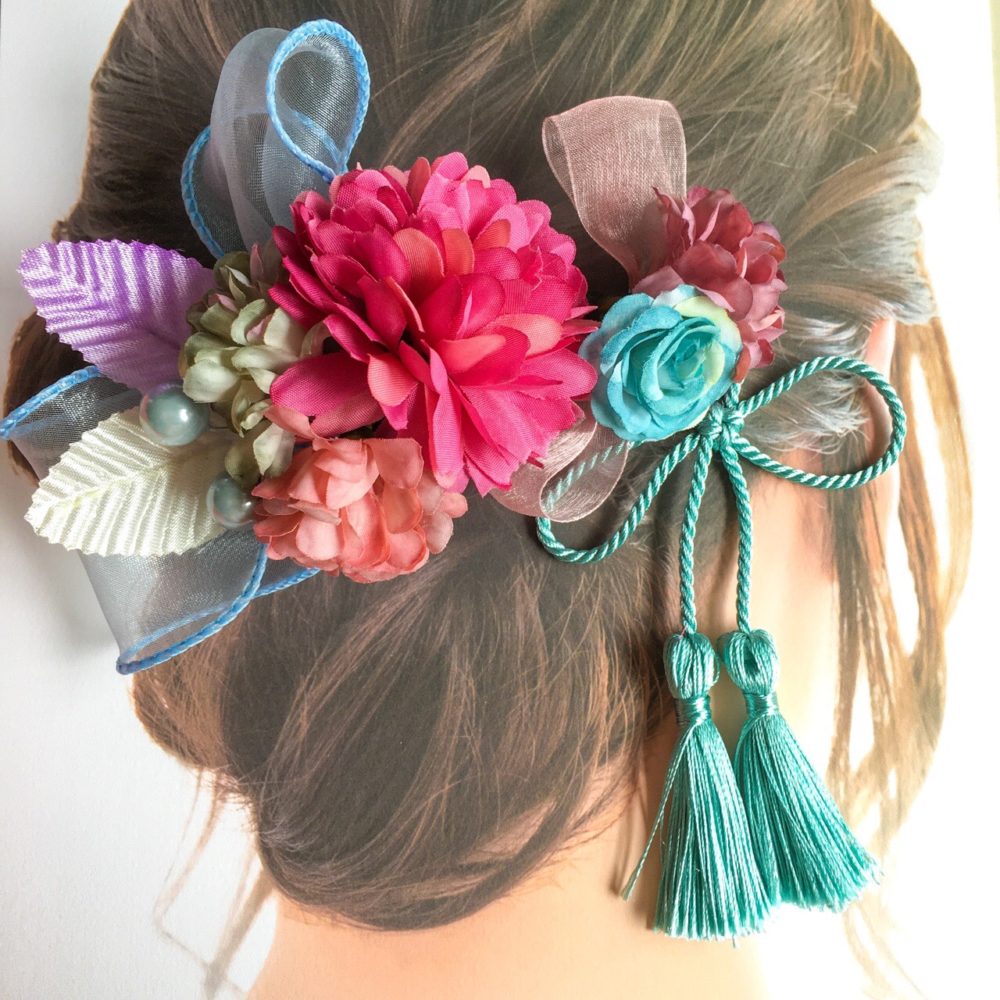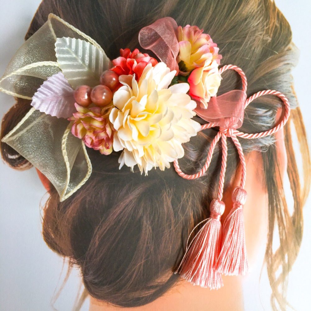 和風の髪飾り、ピンポンマムやオーガンジーリボンを合わせて