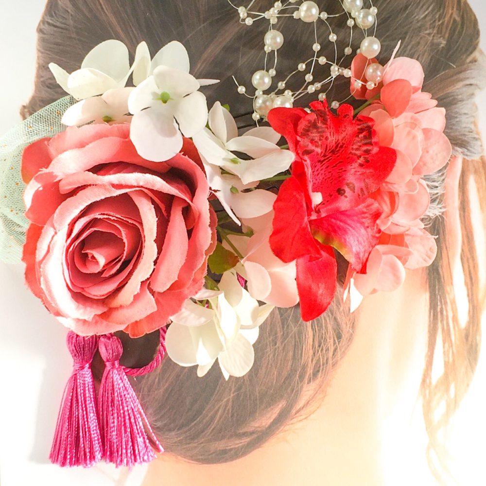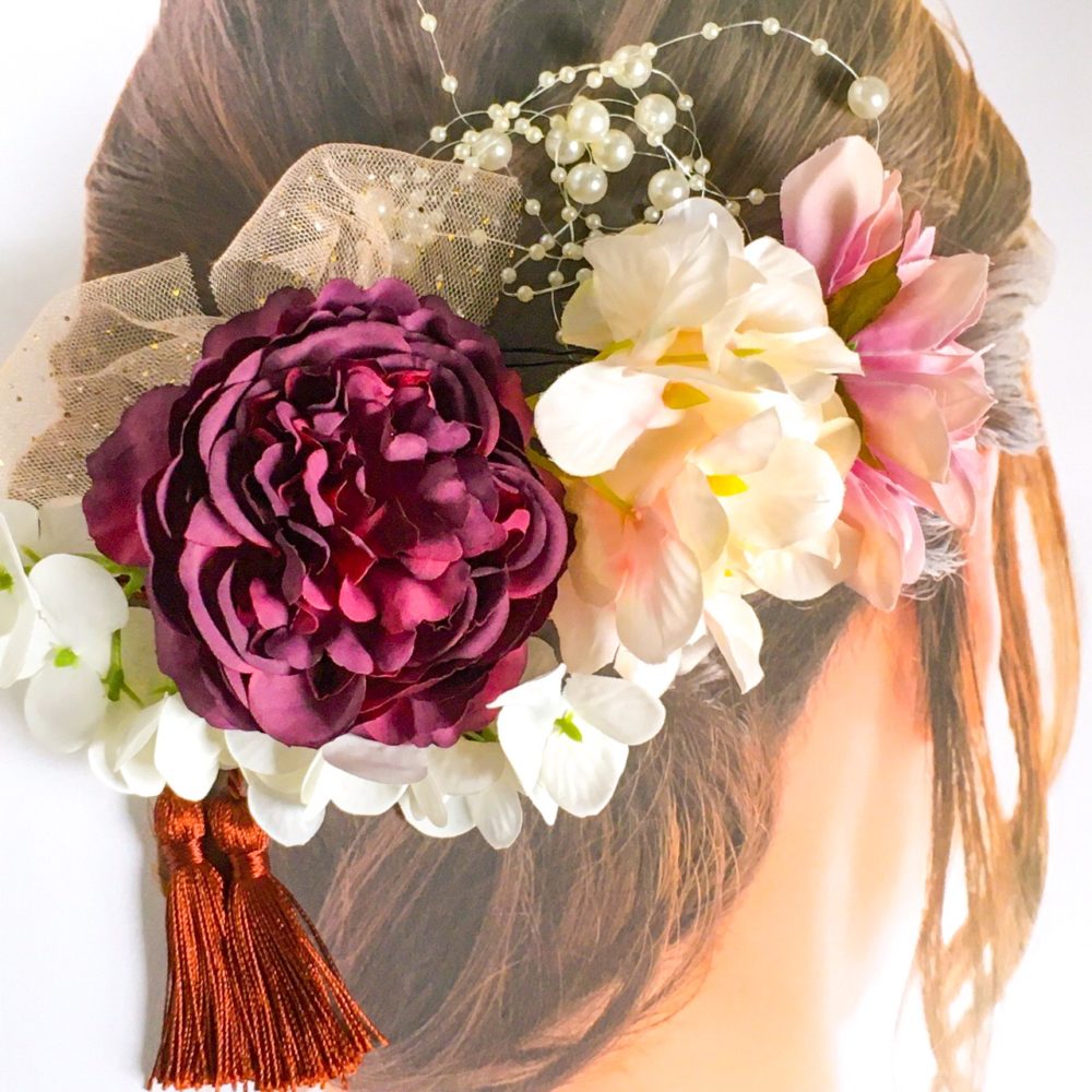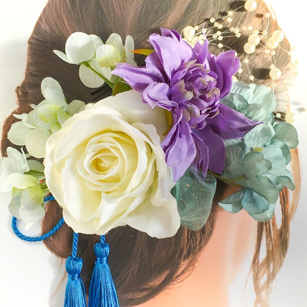 薔薇と紫陽花の大ぶりのお花の髪飾り。和洋折衷、レトロ、ポップ、成人式に。